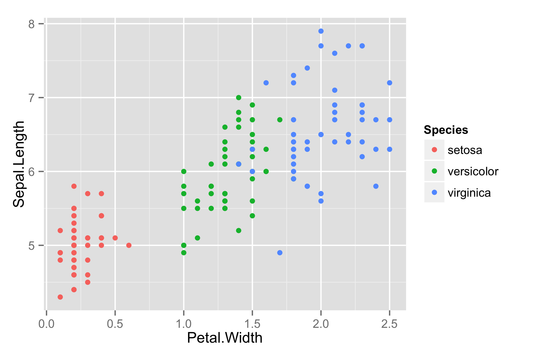 ggiris <- qplot(Petal.Width, Sepal.Length, data = iris, color = Species)
