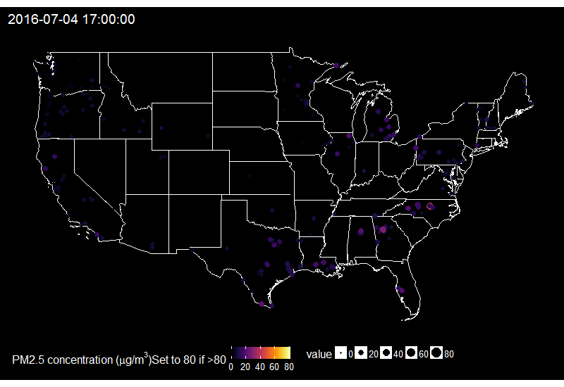 On this gif, where the title indicates the time in New York City, one sees the East to West wave of PM2.5 peaks due to fireworks as soon as it gets dark in each city, which happens at different times across the US. I think it’s an interesting way of looking at this holiday. Holidays and fireworks are one thing, but one could also imagine coupling ropenaq data with data about fires, or weather, for which rOpenSci got you covered with rnoaa (https://github.com/ropensci/rnoaa) and riem (https://github.com/ropensci/riem). Or for parts of the world with a high density of locations, why not compare air quality with land-use information from Openstreetmap via osmdata and with transit information processed via gtfsr?