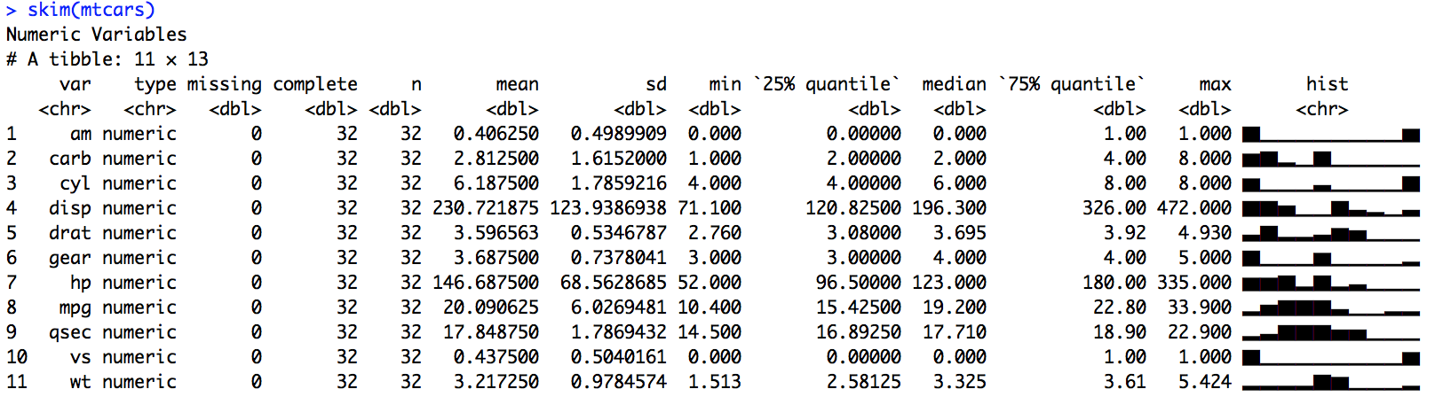 Summary: skimr, a package inspired by Hadley Wickham’s precis package, aims to provide summary statistics iteratively and interactively as part of a pipeline. The package provides easily skimmable summary statistics to help you better understand your data and see what is missing.