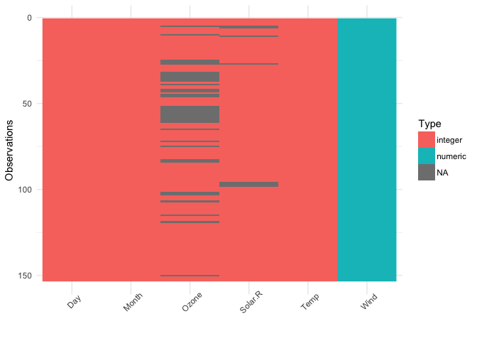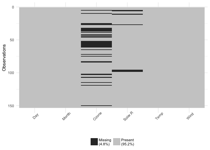 This shows only missing and present information in the data. In addition to vis_dat() it shows the percentage of missing data for each variable and also the overall amount of missing data. vis_miss() will also indicate when a dataset has no missing data at all, or a very small percentage.