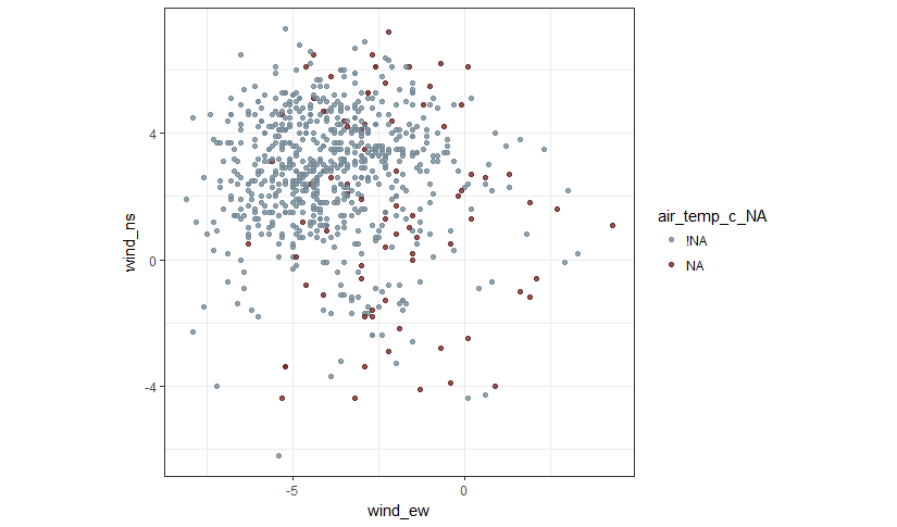 # Here missing status on air temperature is shown in a plot of the two wind variables