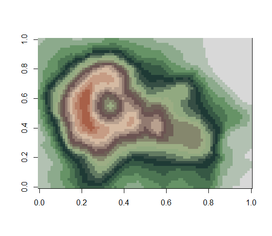 olsen_seq has been designed for plotting sequential data, such as a heat map or landscape layers. The colours come from the abstract piece “Sydney Sun”, 1965, by John Olsen.