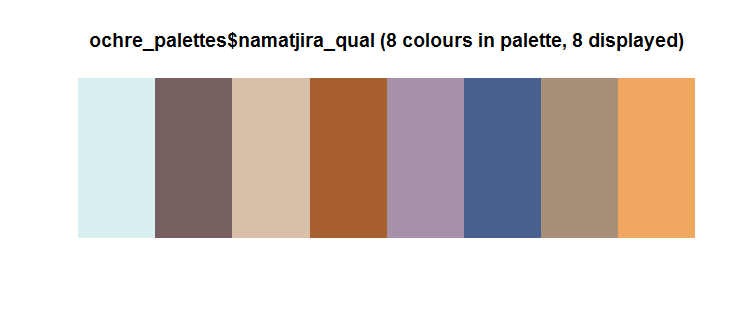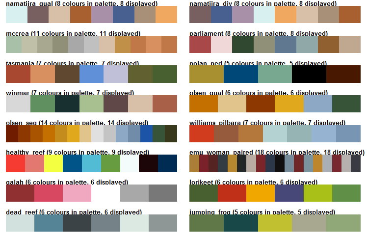 The ochRe package contains colour palettes influenced by the Australian landscape, iconic Australian artists and images. OchRe is originally the brain-child of Di Cook, who was inspired by Karthik Ram’s wesanderson package.