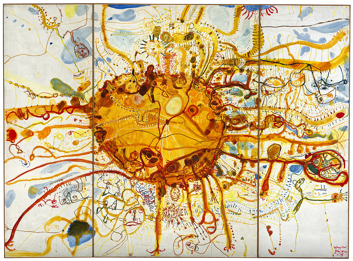 olsen_seq has been designed for plotting sequential data, such as a heat map or landscape layers. The colours come from the abstract piece “Sydney Sun”, 1965, by John Olsen.