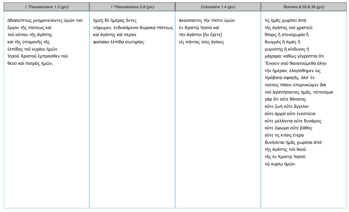 Suppose I am writing a paper on different expressions of love in Paulâs letters. Naturally, I start in 1 Corinthians 13, the famed âLove Chapterâ often heard at weddings and seen on bumper stickers. I finish the chapter and turn to the margins. In the image below, I see references to Colossians 1:4, 1 Thessalonians 1:3, 5:8, Hebrews 10:22-24, and Romans 8:35-39.