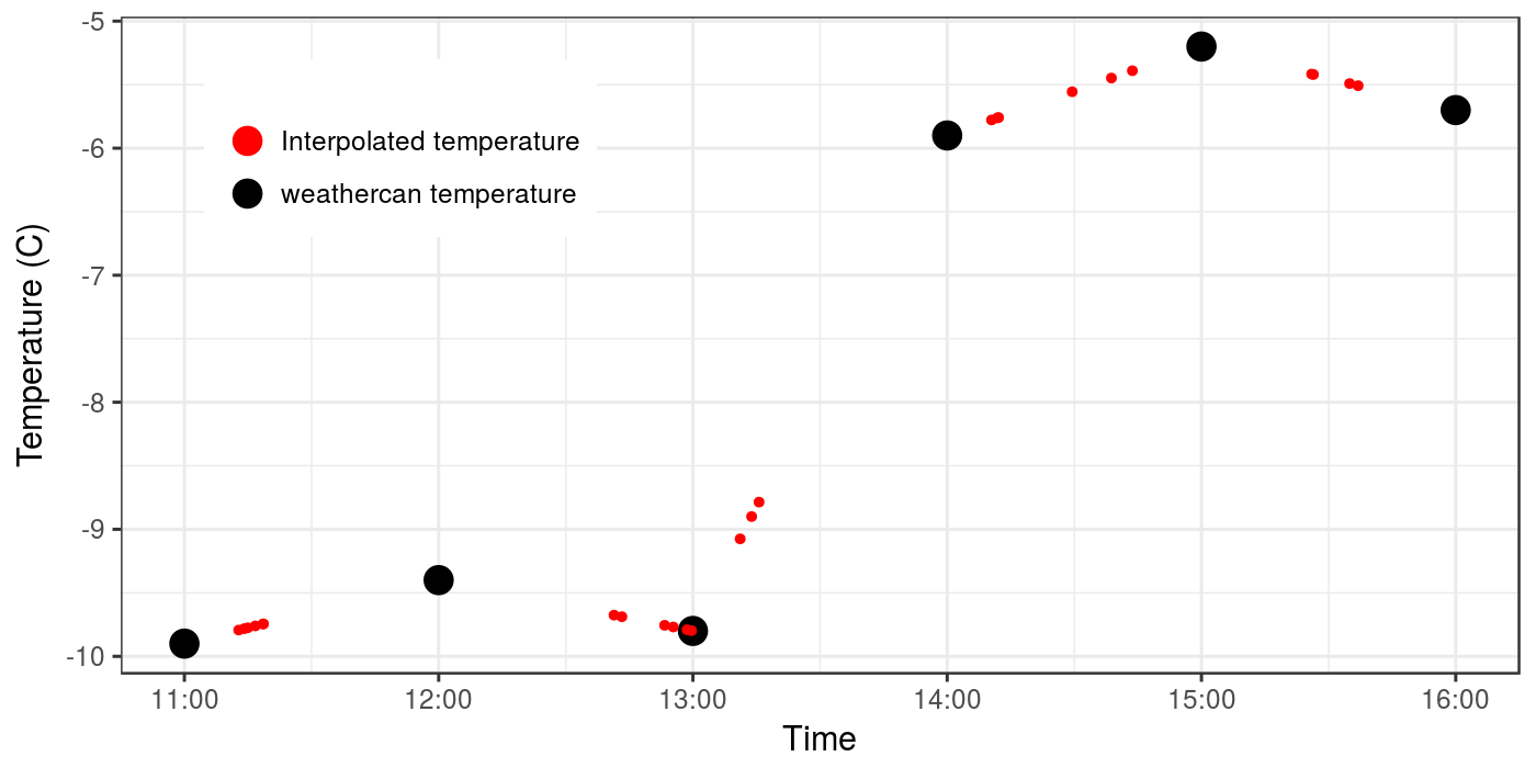 To illustrate how this works, let’s take a look at the temperature measures downloaded with weathercan (large black dots), vs. the interpolated values now stored with the feeder data (small red dots).