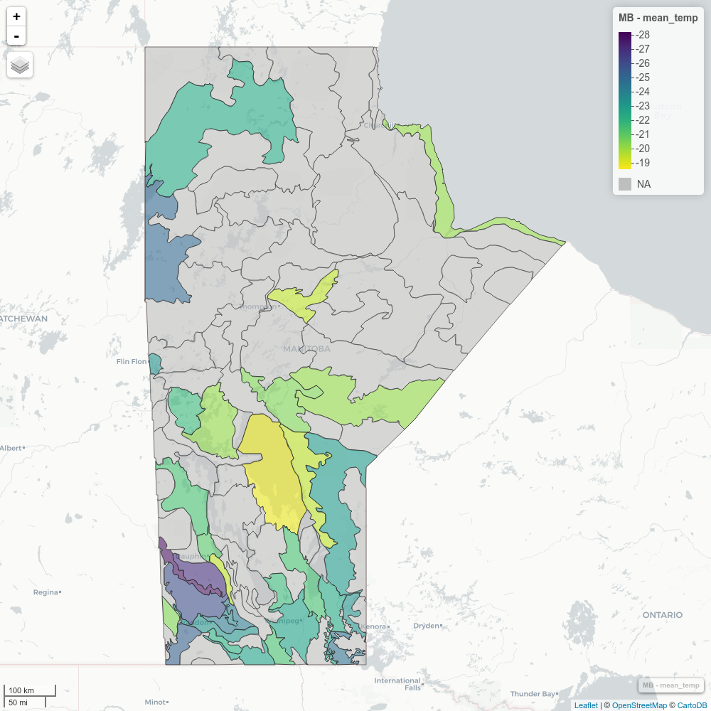 In this final example we will use the sf and mapview packages to visualize average temperature across different ecological regions in Manitoba on New Year’s Day, 2018.