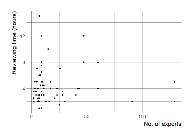 Interestingly, we find no relationship between the reviewing time and number of exports: