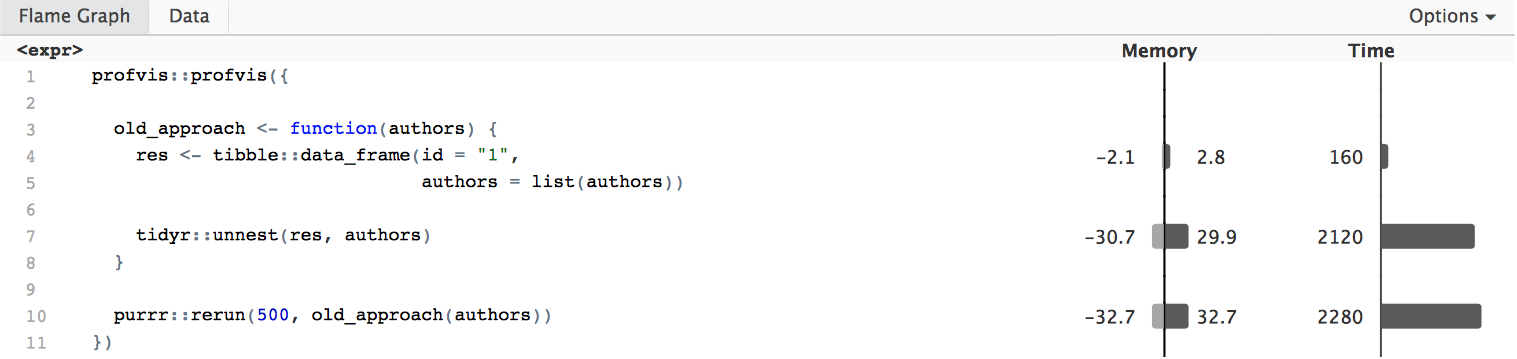 We can see that the call to tidyr::unnest takes up a lot of time, thus