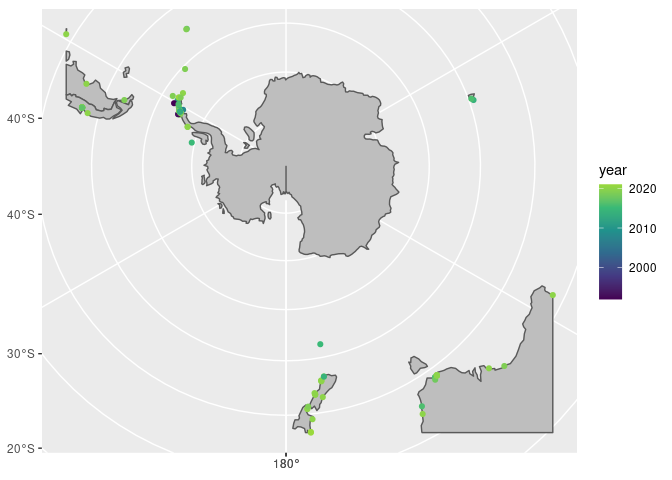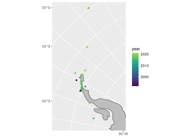 Looks like most observations are around the Antarctic Peninsula, let’s take a closer look!